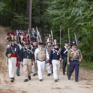 - See a “Sham Fight” as rival militia companies square off against each other in the field.