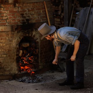 The kiln at Old Sturbridge Village, a replica of Hervey Brooks’s kiln, is made with 15,000 bricks. It stands 24 feet tall and must be heated to approximately 1,900 degrees Fahrenheit during firing, which requires three cords of wood stoked over 24 hours. When it is fully loaded, the kiln can hold 800 pieces stacked 10 feet high. The pieces that emerge from the firing are truly one-of-a-kind and available for sale in our shops, both in-store and online.